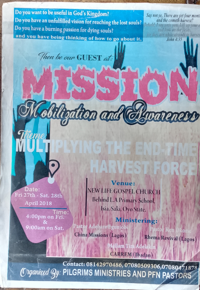 - Pilgrims House, behind L.A Primary School, Isia, Saki, Oyo State, Nigeria